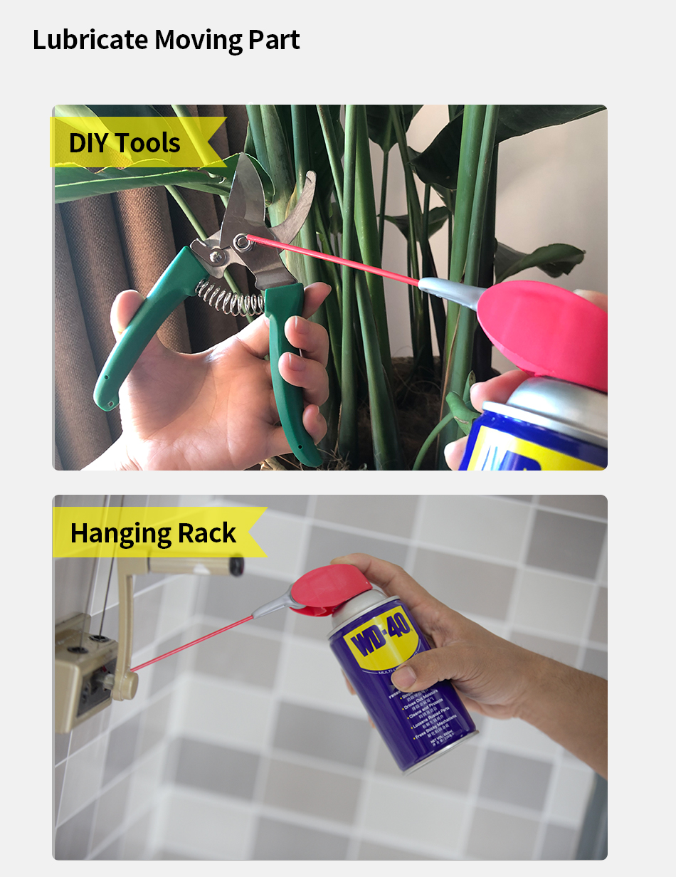 WD-40® Multi-Use Product lubricates moving parts such as hinges, wheels, rollers, chains and gears. It protects against rust and corrosion on items like tools and sporting equipment. It penetrates to free stuck corroded parts like nuts, bolts, valves and locks. It quickly removes adhesives, corrosion and paint. It displaces moisture to restore water flooded equipment such as engines, spark plugs and power tools.